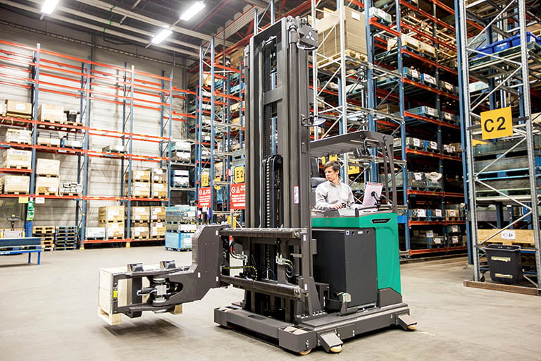 De smallegangentrucks zijn voorzien van een uniek ontworpen mast die de bestuurder een optimaal zicht biedt op de vorken en lading. Dit geeft de bestuurder meer vertrouwen en verhoogt de veiligheid en productiviteit tijdens het werken in smalle gangpaden en hoge stellingen. Met deze innovatieve functie heeft de bestuurder altijd een duidelijk beeld van zijn omgeving en kan hij veilig en efficiënt werken.